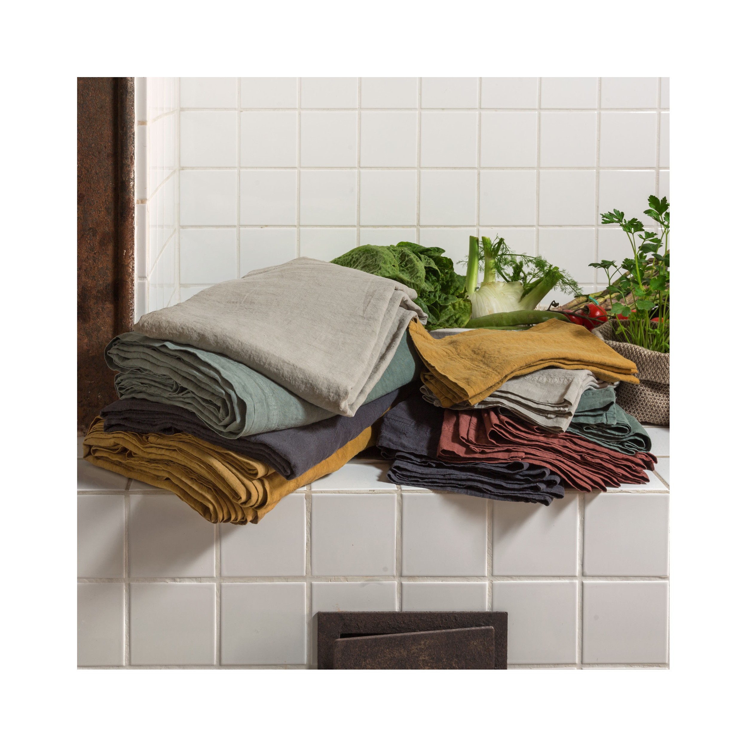 Les nappes sont confectionnées dans un joli tissu de lin tissé, fabriqué, teint et adouci grâce au savoir-faire des artisans français.