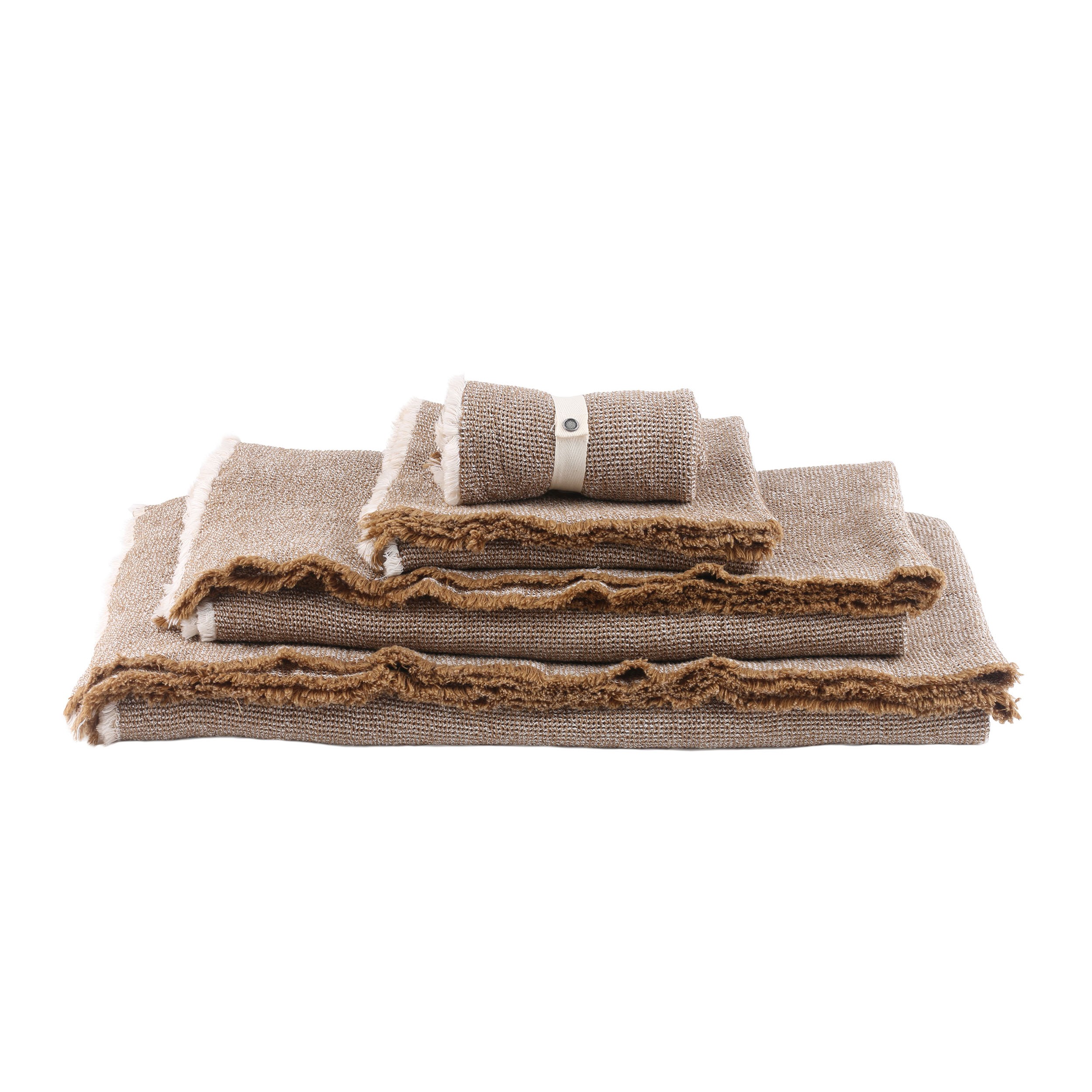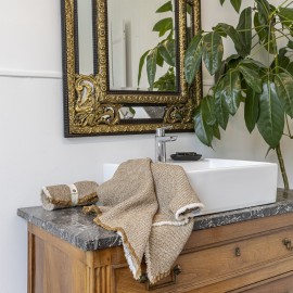 Collection of honeycomb towels made from an optimal blend, linen for absorption and cotton for softness. The weave is lightweight to allow quick drying. The combination of the two dyed threads and the fringed finishes give a relaxed and decorative appearance.